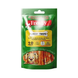 Freshy Twist Kurutulmuş Et Kaplı Tavuklu Köpek Çiğneme Çubuğu 13 Cm 10’lu, dış yüzeyi tamamen kurutulmuş saf tavuk etiyle sarılı, köpeğin çene kaslarını güçlendirirken plak oluşumunu önleyen 13 cm’lik ideal ödül çubuklarıdır.