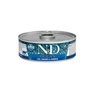 N&D Ocean Bal Kabaklı, Morina Balıklı & Karidesli Yavru Kedi Konserve Maması 80 Gr, yavru kedilerin beyin ve göz gelişimini destekleyen taze deniz ürünleri ve balkabağıyla hazırlanmış enfes bir başlangıç mamasıdır.