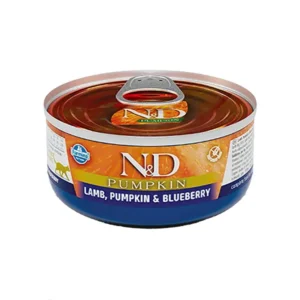 N&D Pumpkin Tahılsız Bal Kabaklı, Kuzu Etli & Yaban Mersinli Yetişkin Kedi Konserve Maması 70 Gr, taze kuzu eti ve balkabağının harika uyumuyla sindirimi kolaylaştıran, bağışıklık destekleyici tamamen tahılsız sıvı takviyesidir.