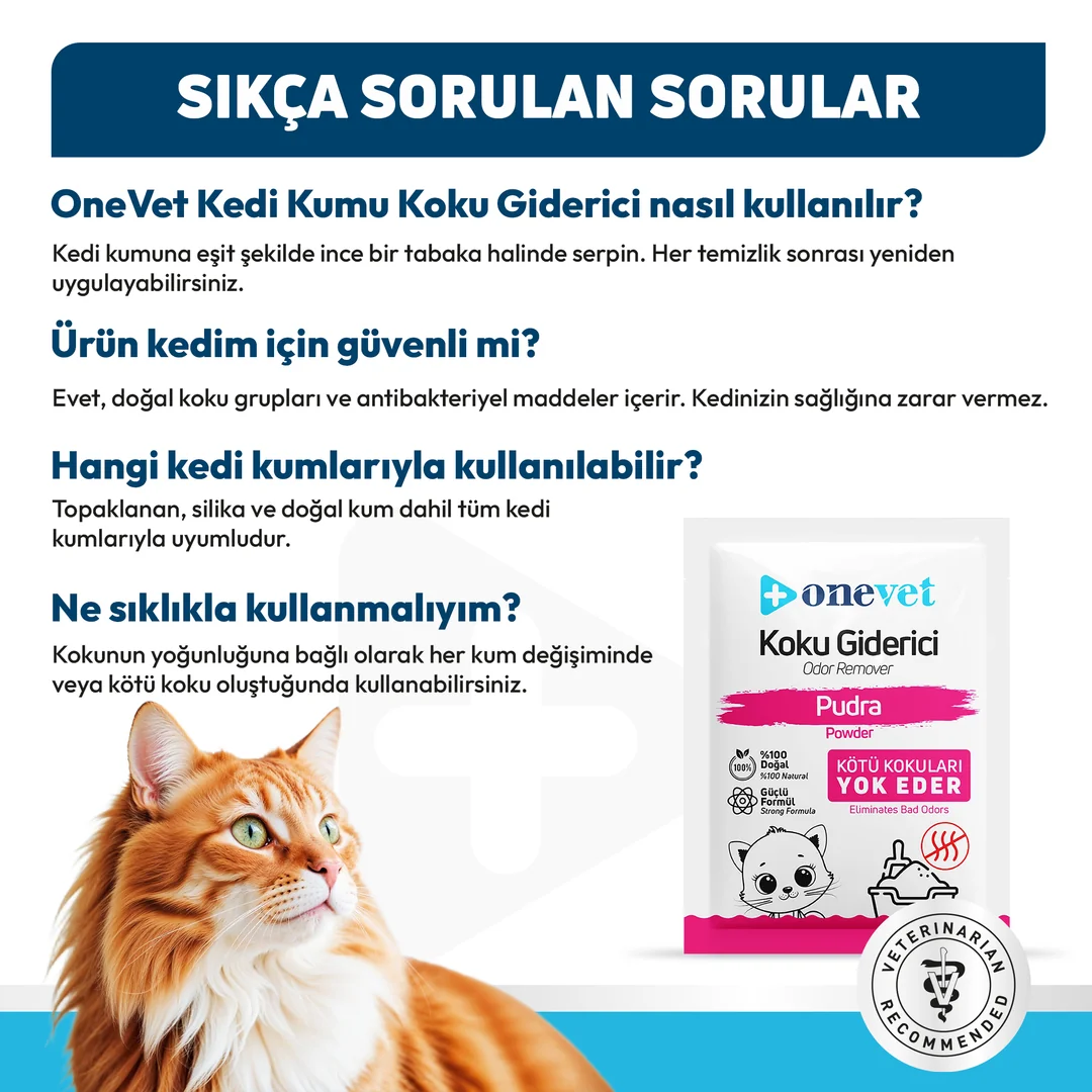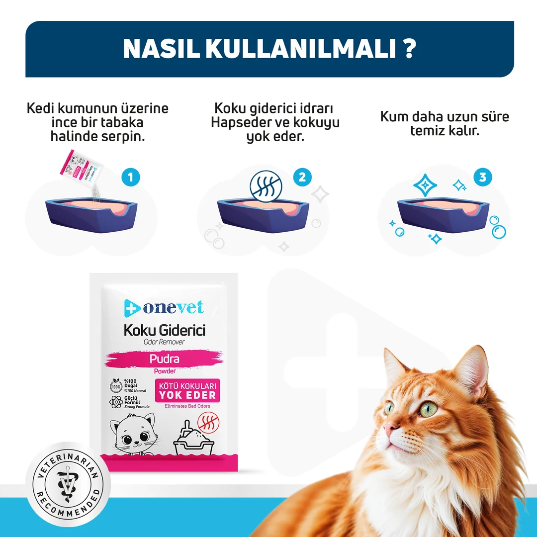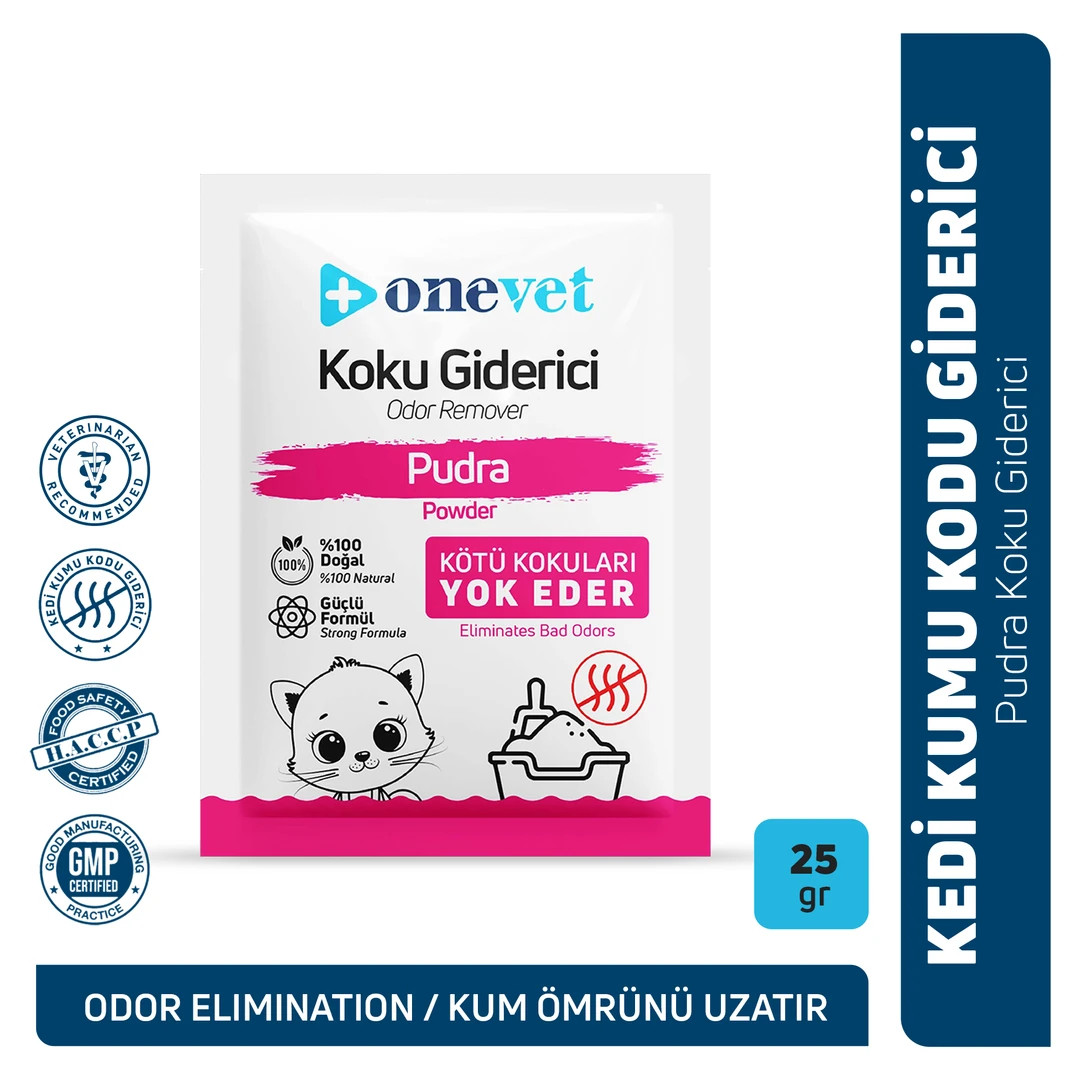 Kedi kumunuz çabuk kokuyor ama hemen değiştirmek istemiyor musunuz? OneVet Pudra Koku Giderici, kumun üzerine serpildiğinde kötü kokuları anında hapseder ve ortama mis gibi bebek pudrası kokusu yayar.