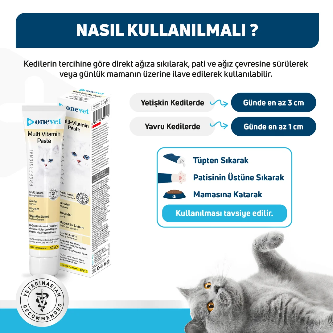 Kedinize hap içirmekle uğraşmayın. OneVet Multi Vitamin Paste, kedinizin günlük vitamin ihtiyacını en sevdiği formda, macun olarak sunar.