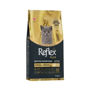 Reflex Plus British Shorthair Yavru Kedi Maması 1,5 Kg, British Shorthair ırkının iri ve kaslı yapısını desteklemek üzere tasarlanmış, L-Karnitin ve XOS prebiyotik içeren süper premium yavru kedi mamasıdır.